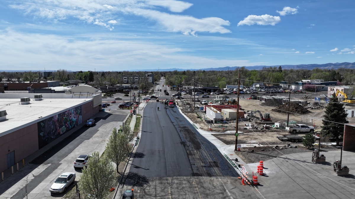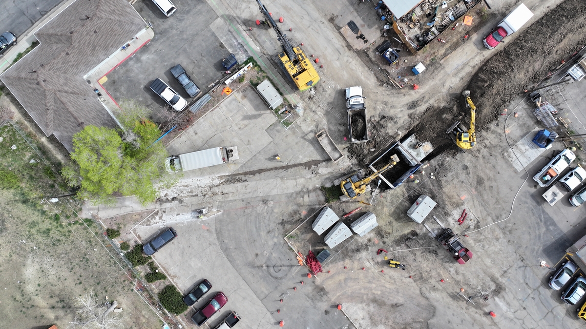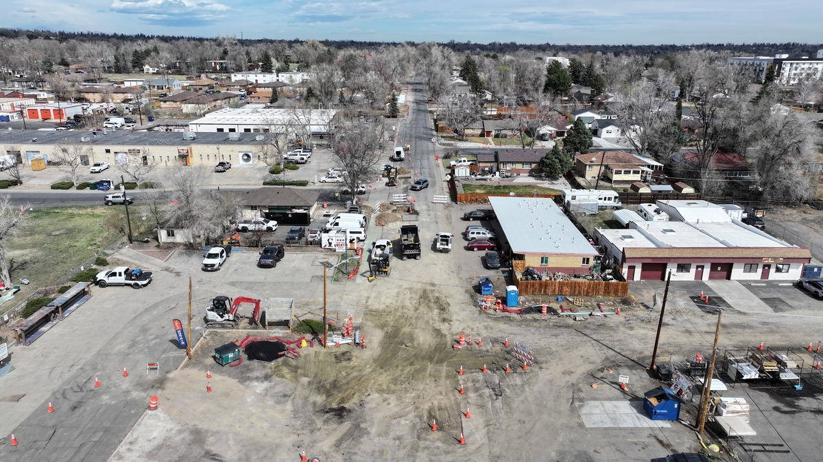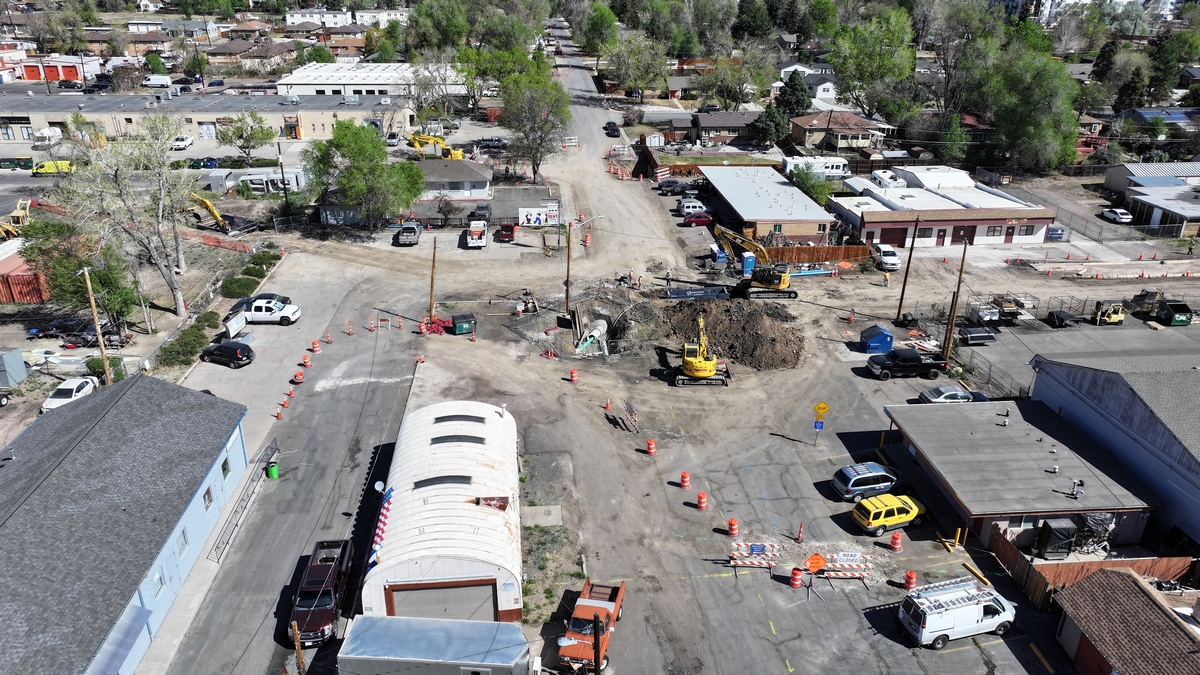 Aerial top down picture showing the construction at the intersection of Lakewood Pl and Reed St.